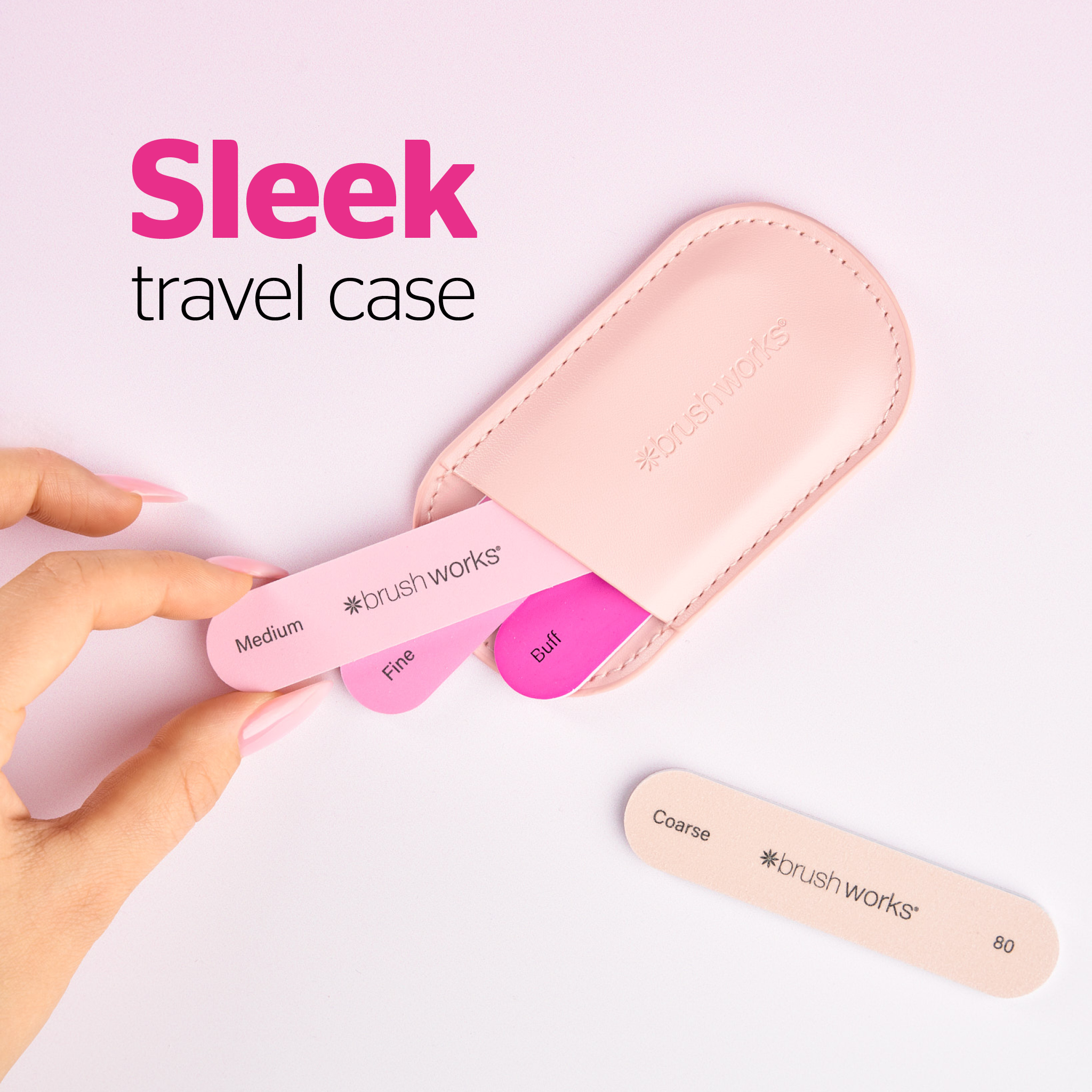 Always file in one direction to protect the nail surface. After use, wipe each file clean and store them in the travel case to keep them organised and ready for your next manicure.